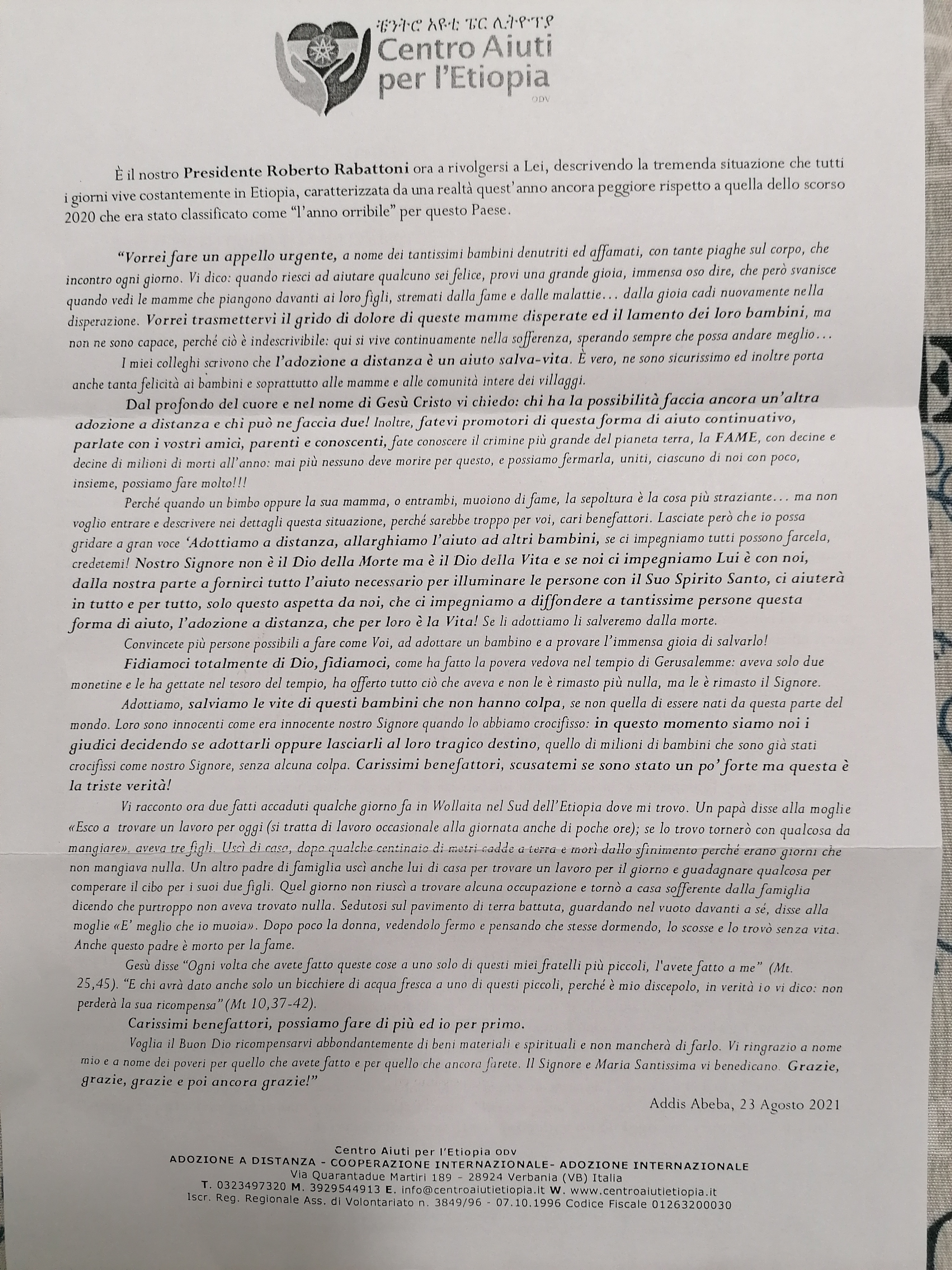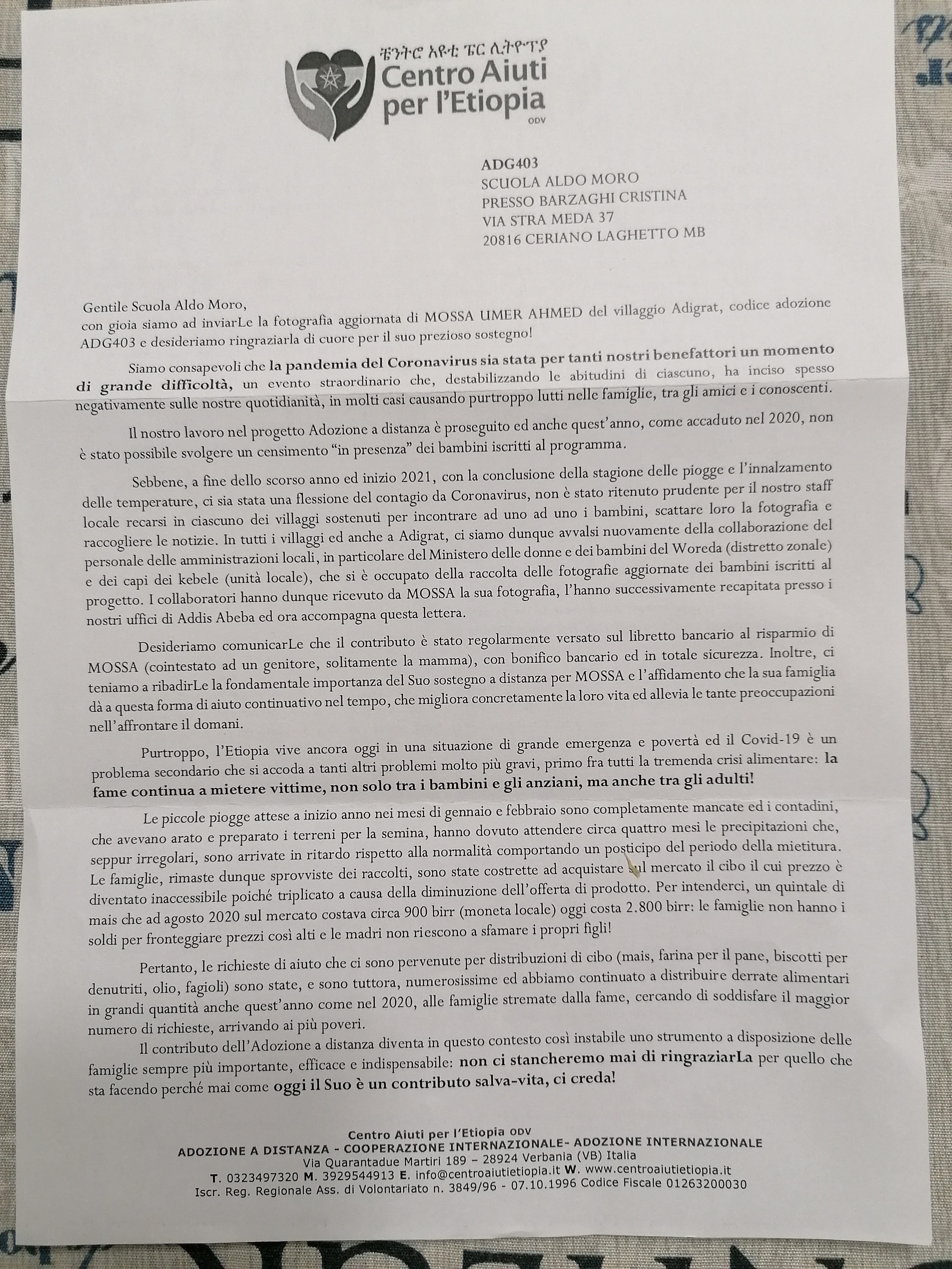 Si comunica che, anche per l’anno scolastico in corso 2021/2022, sarà realizzato il progetto "Adozioni a distanza” con il Centro aiuti per l’Etiopia. (http://www.centroaiutietiopia.it/it/adozione_a_distanza.php)