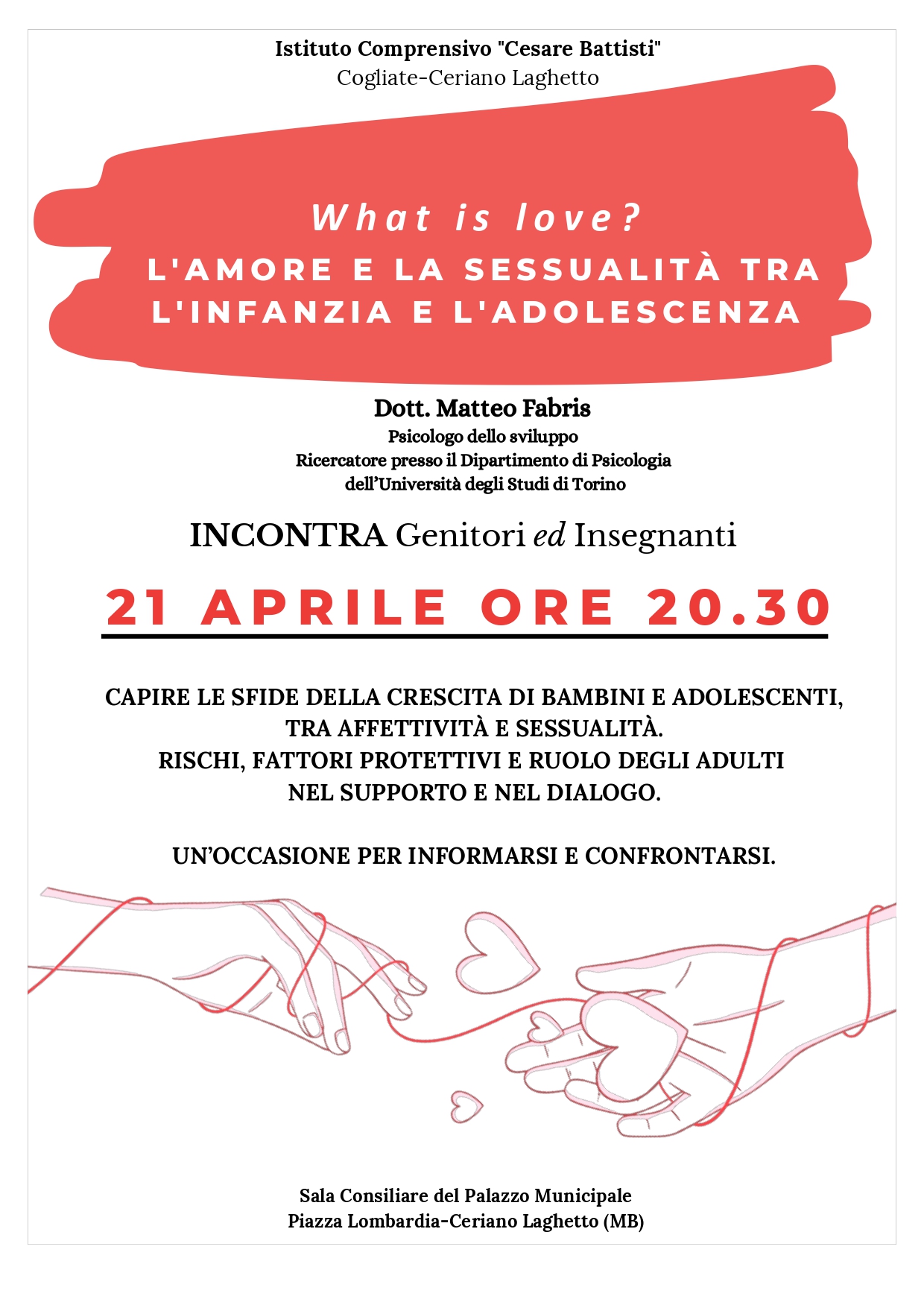 l’Istituto Comprensivo “Cesare Battisti” di Cogliate–Ceriano Laghetto è lieto di invitare le SS.LL. all’incontro formativo-informativo dal titolo: